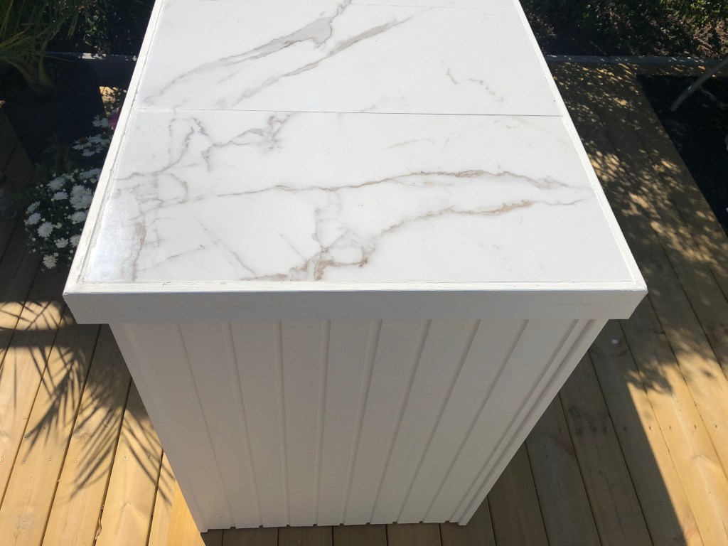 We were going to build the kitschen island from scratch. As a counter top, we wanted something durable and beautiful, but also something that did not require too much work. We decided to use marble-inspired tiles. At a Bauhaus store we found 60×30 frost-proof tiles. It had to be the starting point for the construction and set the dimensions.