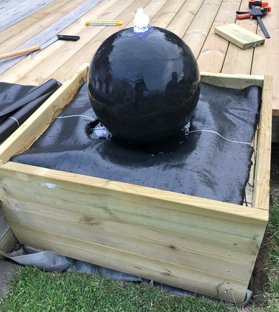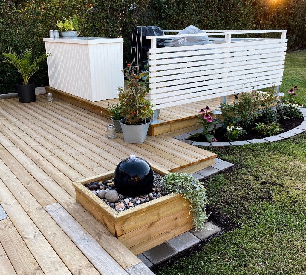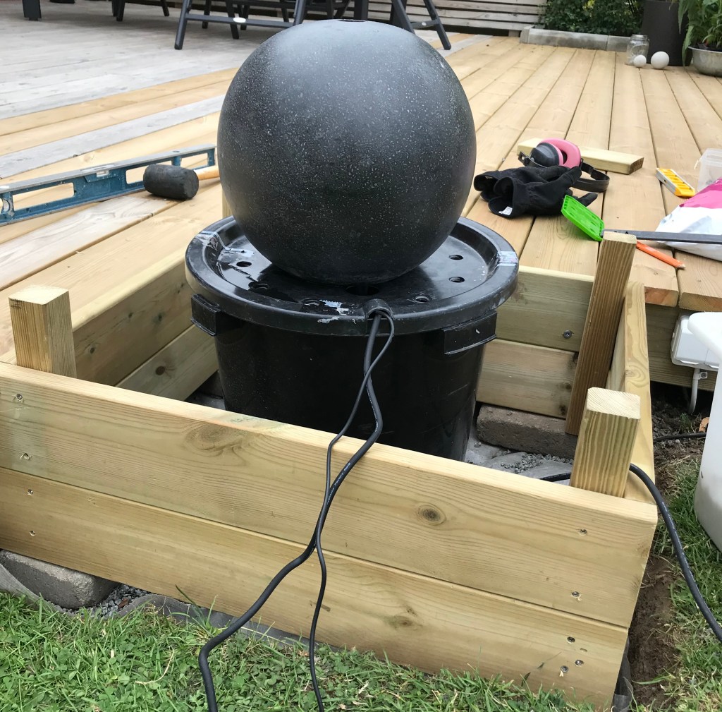 Vad vore en trädgård utan porlande vatten och konstnärlig utsmyckning? Ljudet av vatten skapar lugn och stämning i trädgården. Sten som kontrast till trä och gräs skapar omväxling. Vi hittade för över ett år sedan en (i vårt tycke) smakfull fontän med ett elegant stenklot. Vi hittade dock inget bra ställe att ha den på så den blev stående. Men när vi byggde ut altanen hittade vi äntligen ett bra ställe. Så här byggde vi.