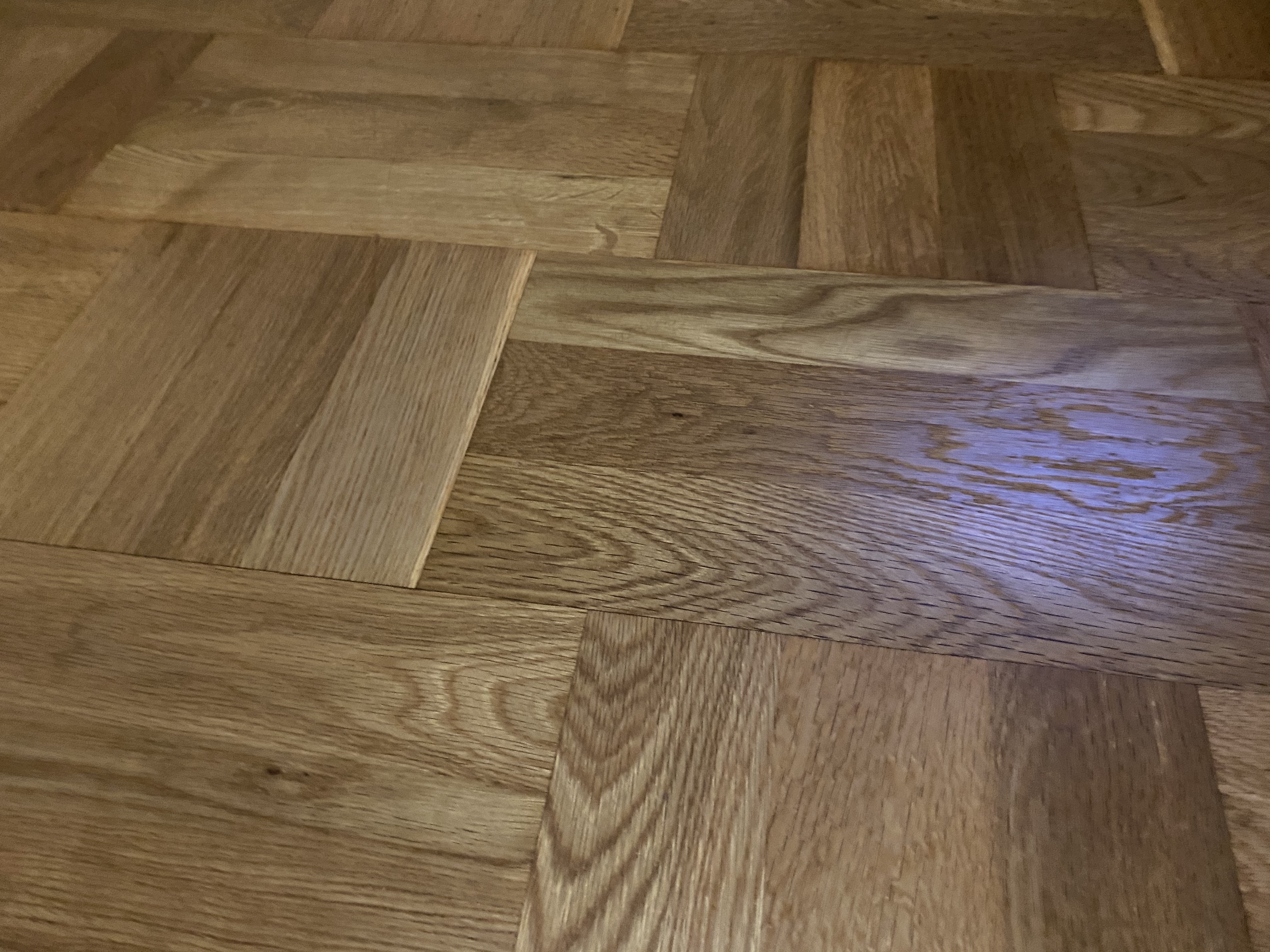 När man är klar med slipning är det dags att välja beläggning. Vi valde hårdvaxolja. Det ger samma fina yta som att olja men kräver inte allas samma regelbundna underhåll. Vi har använt Osmos produkter och är mycket nöjda med resultatet.