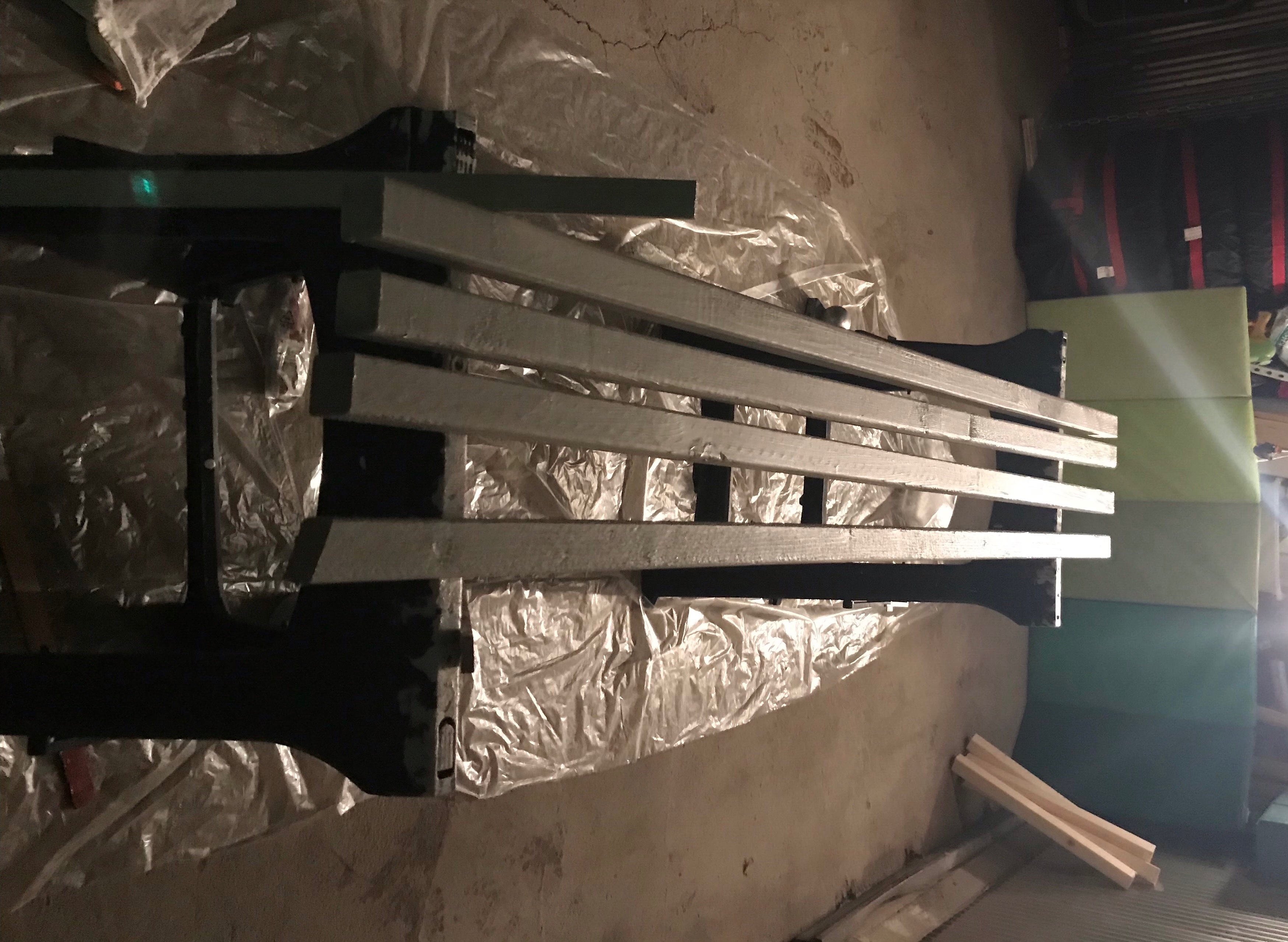 Eftersom det var kallt och småregnigt vid byggtillfället förmålade vi i garaget innan montering. Materialet som krävdes var 4 st reglar 45*45 mm, några smala och tunna tvärslå samt en stolphatt 91*91 mm med kula uppe på. Vi valde att göra tornet 185 cm högt. Vi sågade ändarna upp till sneda på två håll för att alla reglerna skulle rymmas i stolphatten.