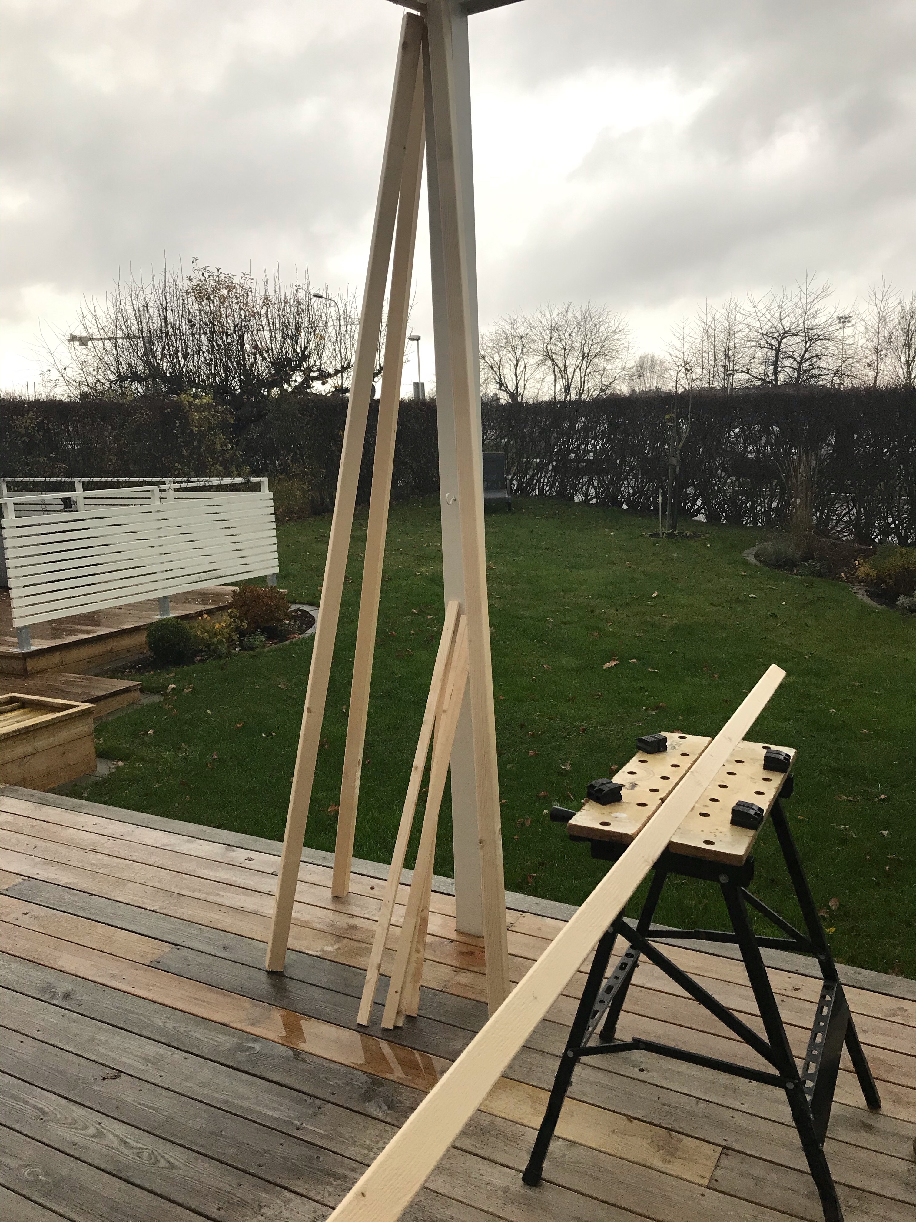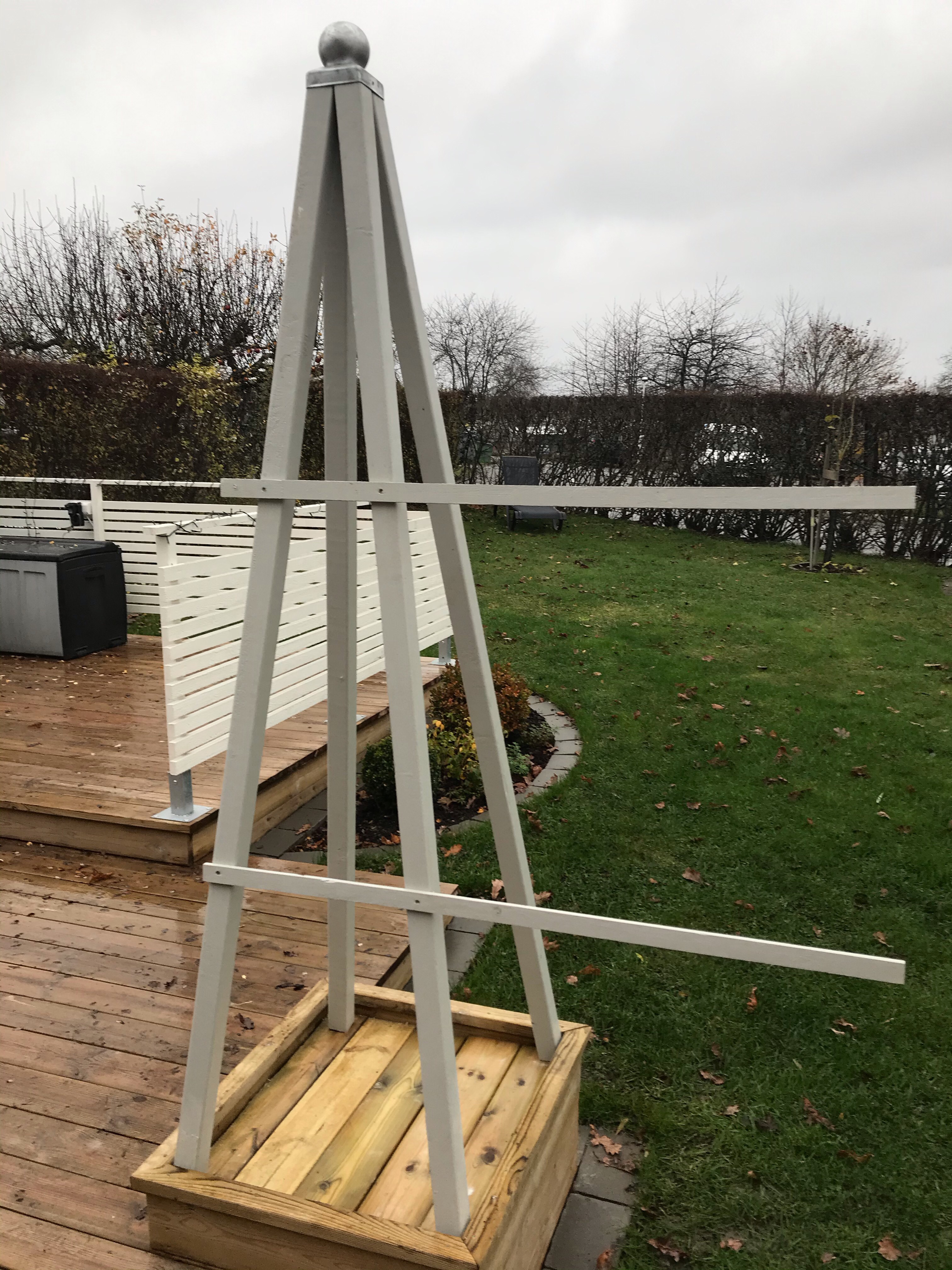 För att mota bort en del av mörket under vinterhalvåret byggde vi ett ljustorn som kommer bli växtstöd under sommarhalvåret. Projektet tog några timmar från inköp till att det var färdigställt.